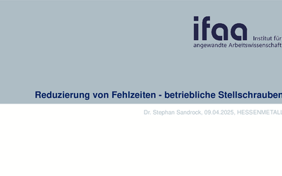 Nach einer gemeinsamen Einführung von Nikolaus Schade, Leiter der Abteilung Arbeitswissenschaft von HESSENMETALL und Martina Stüting, Leiterin des CoC Arbeitsschutz, gab Herr Dr. Sandrock, Fachbereichsleiter Arbeits- und Leistungsfähigkeit beim Institut für angewandte Arbeitswissenschaft (ifaa) einen Überblick zu betrieblichen Ansatzpunkten zur Reduzierung von Fehlzeiten und zu Stellschrauben, die die „Bettkantenentscheidung“ zugunsten des Arbeitgebers beeinflussen können. Dabei stellte Herr Dr. Sandrock die Bedeutung der Führungskräfte heraus.