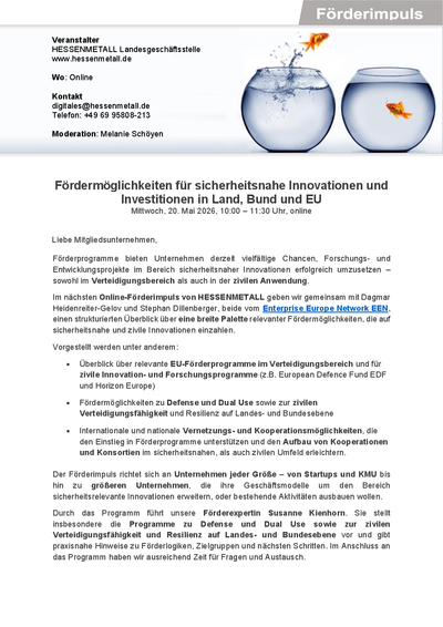 Im nächsten Online-Förderimpuls von HESSENMETALL geben wir gemeinsam mit Dagmar Heidenreiter-Gelov und Stephan Dillenberger, beide vom Enterprise Europe Network EEN, einen strukturierten Überblick über eine breite Palette relevanter Fördermöglichkeiten, die auf