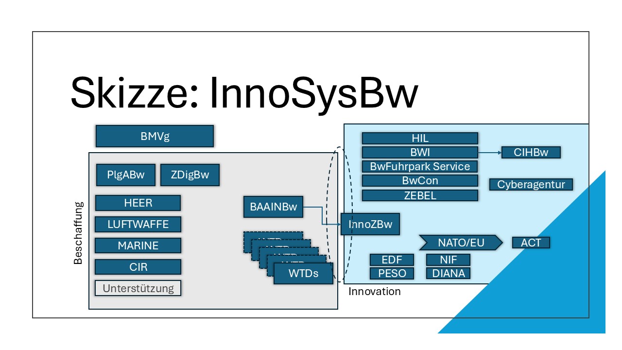 | Innovationszentrum der Bundeswehr (InnoZBw) | Zentrale Einheit zur Identifikation, Bewertung und Erprobung neuer Technologien für die Bundeswehr. | Website |