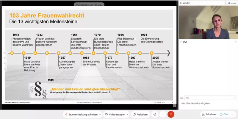 Mehr als 40 Teilnehmerinnen waren bei der ersten interaktiven, digitalen Veranstaltung am 20. Januar 2021 dabei. Den Impuls-Vortrag lieferte Dr. Ariane Reinhart, Continental AG.