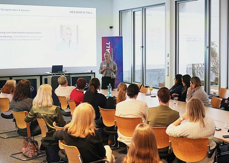 Am 24. November 2025 folgten 25 Teilnehmerinnen aus dem HESSENMETALL Netzwerk Frauen in Führungspositionen der Einladung von Elke Stümpfel, HR Director Germany & Austria De'Longhi Deutschland GmbH, in die Unternehmenszentrale nach Neu-Isenburg. In den modernen Räumlichkeiten des Unternehmensstandorts gab es zu Beginn Snacks und Drinks in der geschmackvoll eingerichteten Meeting Lounge. Hier bot sich ausreichend Gelegenheit zu einem ersten Austausch mit dem Team von De'Longhi sowie den Netzwerk-Mitgliedern.