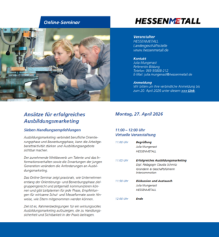 Das Online-Seminar zeigt praxisnah, wie Unternehmen entlang der Orientierungs‑ und Bewerbungsphase zielgruppengerecht und zeitgemäß kommunizieren können und gibt Leitplanken für jede Phase, Empfehlungen für wirksame Schul‑ und Messeformate sowie Hinweise, wie Eltern mitgenommen werden können.
