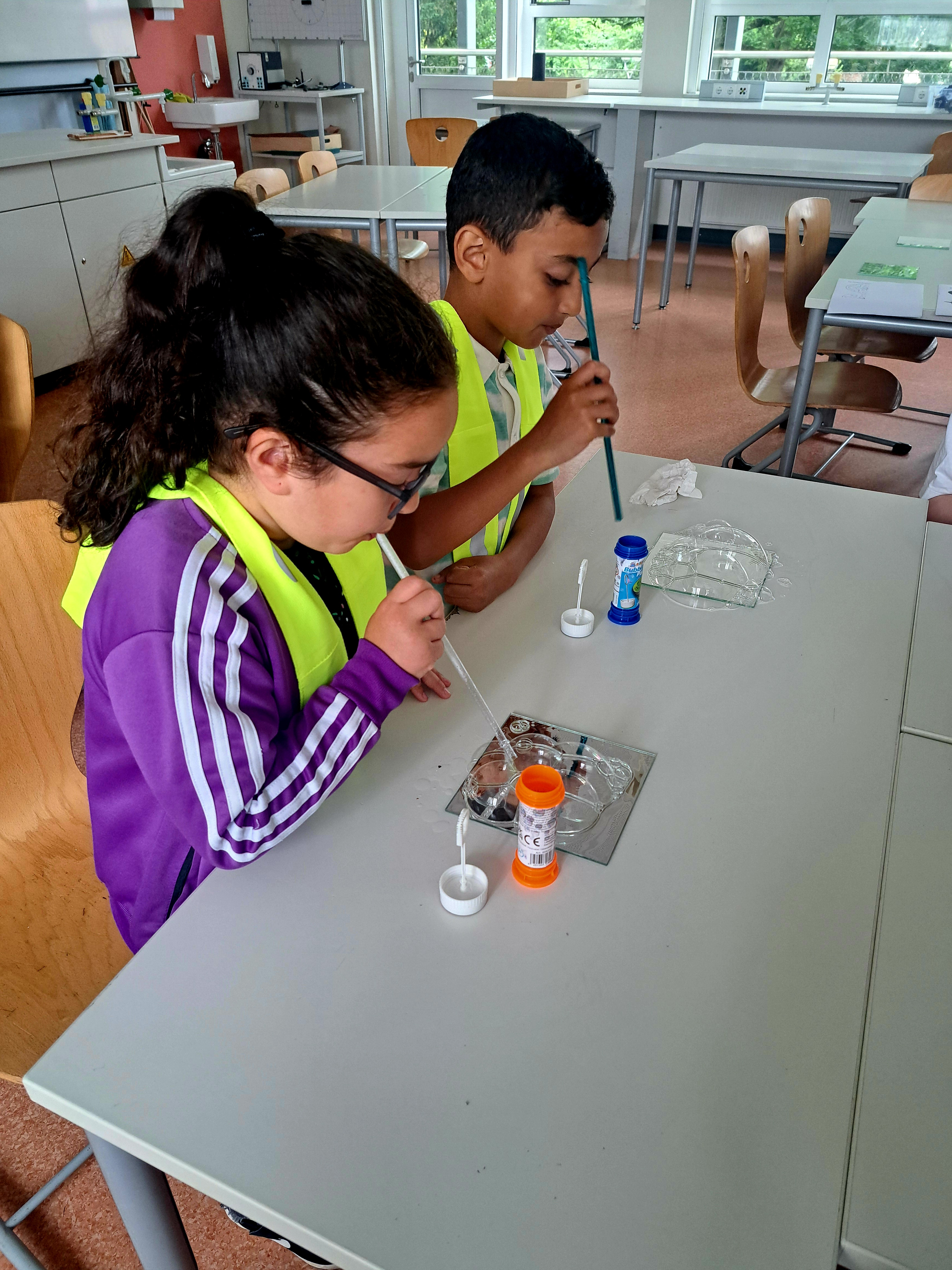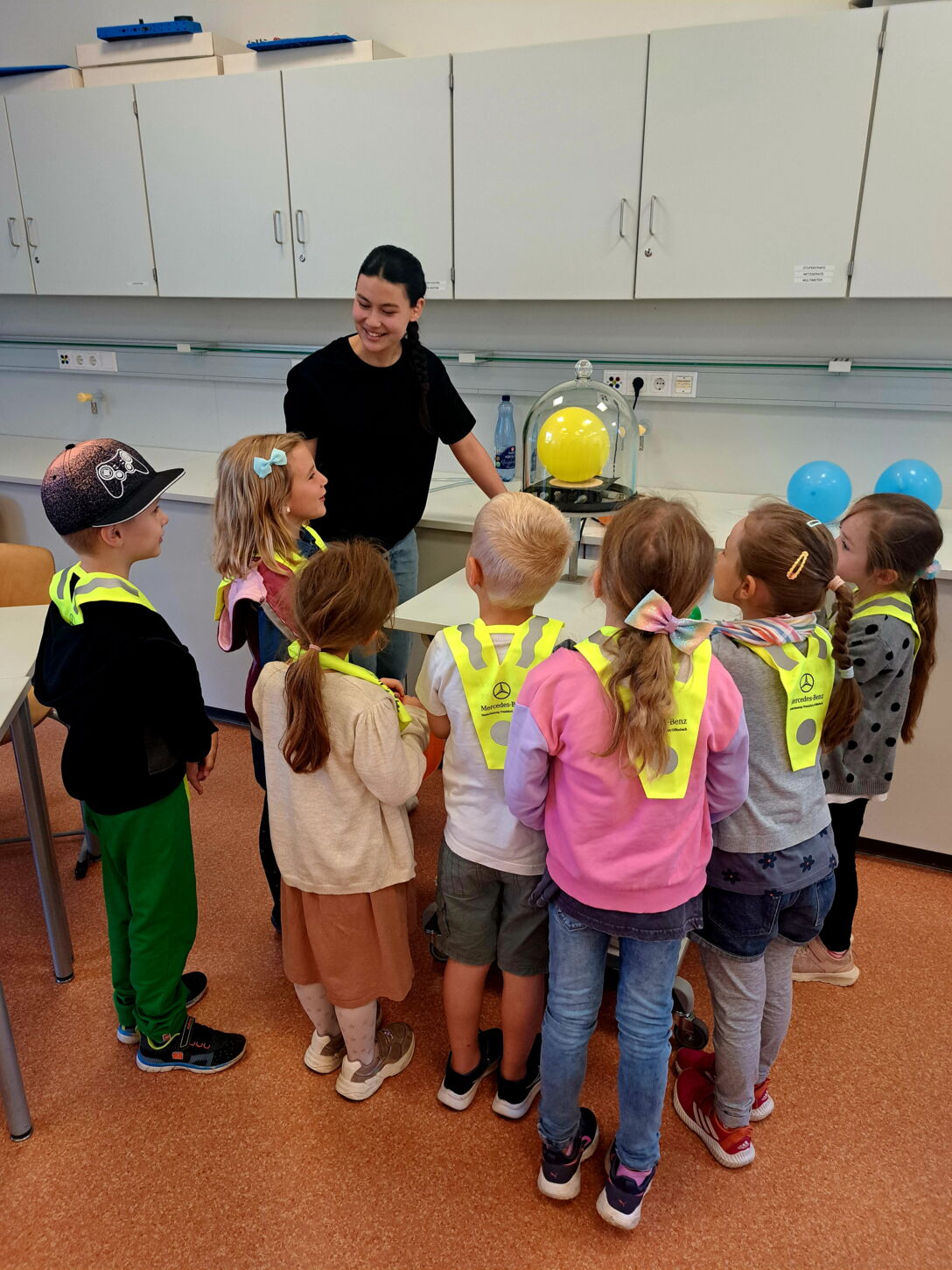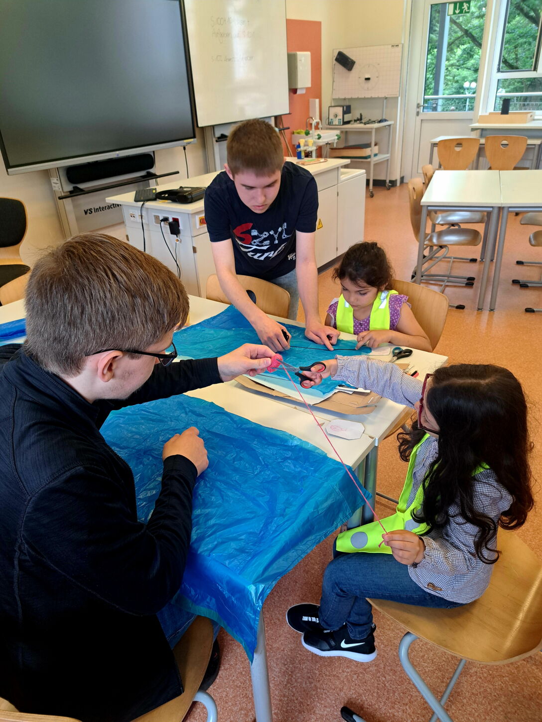 An beiden Schulen hatten die Kindergartenkinder Gelegenheit, zahlreiche spielerische Physik- bzw. MINT-Experimente an verschiedenen Stationen auszuprobieren, welche die Jugendlichen hingebungsvoll vorbereitet hatten und betreuten. Es wurden unter andrem selbst Fallschirme gebastelt, Ballonraketen gestartet und Luftdruckexperimente mit Schokoküssen durchgeführt. Besonders beliebt waren natürlich auch alle Versuche zum Thema Wasser, beispielsweise mit selbstgebauten Schiffchen. Diese und viele weitere Experimente brachten die Kinder zum Staunen und auf die Frage, was am besten war, kam die einhellige Antwort: „Alles!“. Auch die begleitenden Erzieherinnen Jana Zippel, KiTa Margareten, und Sabine Glaffig, KiTa St. Nikolaus, waren beeindruckt: „Es ist immer wieder toll zu sehen, mit welcher Konzentration und Begeisterung die Kids dabei sind!“ Die Schülerinnen und Schüler hatten besonders viel Spaß dabei, den kleinen Forscherinnen und Forschern auf praktische Weise erste Eindrücke von den Naturwissenschaften zu ermöglichen. „Ich finde es schön, dass wir den Kindern zeigen können, wie viel sie schon aus dem Alltag kennen und vor allem, wie viel sie schon selbst ausprobieren können! Zum Glück hatte ich selbst einen tollen Physiklehrer, dadurch habe ich schnell gemerkt, dass mir das Fach Spaß macht. Im Kindergarten hätte ich auch gerne so ein Projekt wie die Physikdetektive gehabt“, so eine der Schülerinnen.